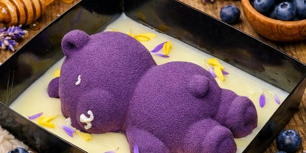 Layers of violet sponge cake, honey-lavender mousse, and blueberry confit, inside a sleeping teddy bear.