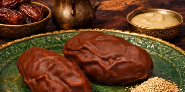 A smooth dessert featuring an airy date mousse that reveals a rich sesame paste and dark carob molasses.