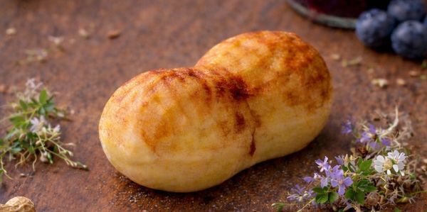 A peanut-shaped cake filled with peanut butter cream and blueberry jam, bringing together sweet nuttiness and fruity nostalgia.