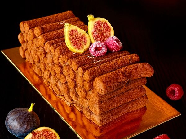 Layers of silky double chocolate, luxuriously ripe figs, and a vibrant raspberry confit come together inside a sculpted firewood stack—an edible winter fairytale crafted with precision and decadence.